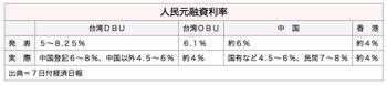 外国為替取扱指定銀行(DBU)の人民元建て融資業務が6日開始となり、融資利率5〜8.25%と、オフショア銀行部門(OBU)の6.1%を上回る高金利が設定された。7日付経済日報が報じた。