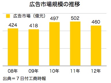 ニールセンの最新統計によると、5大メディア(テレビ、ラジオ、新聞、雑誌、屋外広告)を使った2012年の広告・宣伝費の総額は460億台湾元(約1,450億円)で、前年比8.3%減となった。7日付工商時報が報じた。