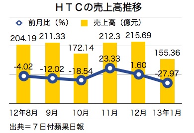 宏達国際電子(HTC)が6日発表した、1月の連結売上高は155億3,600万台湾元(約490億円)で、前月比28%減、前年同月比6.5%減。過去3年で最低となった。「HTC butterfly(バタフライ)」の大人気に生産が追い付かず、売上貢献が小さかったためだ。7日付蘋果日報が報じた。