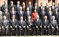 記念撮影の際には陳行政院長(前列中央)の辞任に涙を流し、別れを惜しむ閣僚の姿もみられた(7日=中央社)