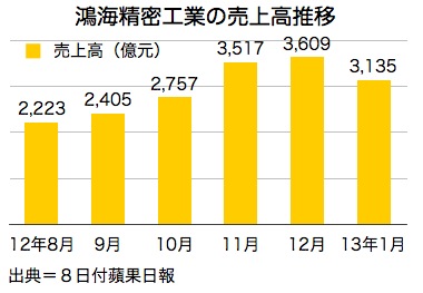鴻海は国際財務報告基準(IFRS)に基づいて今年1月分から、発表する売上高を従来の非連結から連結に改めた。1月連結売上高は、2012年12月の非連結売上高との比較では13.14%の減収だ。