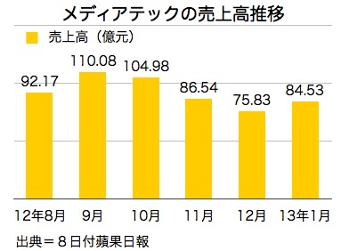 第1四半期の売上目標達成には、2月と3月に1カ月当たり67億2,500万~77億7,500万元の売上高が必要で、証券会社は3月の工場稼働日数回復と、スマートフォン向けクアッドコア「MT6589」の量産によって達成できるとみている。