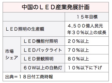 中国の経済紙「中国経営報」によると、同国においてLED照明は品質のばらつきが激しい上に価格が白熱灯の20倍となっているため普及が進んでいない。しかし今後、政府によって白熱灯の使用が禁止されれば、LED照明価格は毎年30%以上のスピードで下落すると予測している。