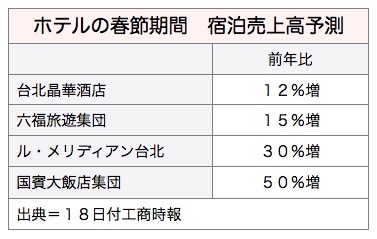 観光ホテルは、台湾人のほか、中国、香港、マカオや、建国記念の日(11日)で3連休となった日本からの訪台旅行者の増加で客室稼働率が上昇した。