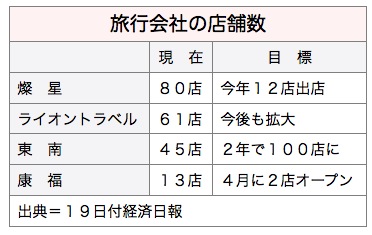 台湾の旅行業界で、東南旅行社(SET)が今月中に支店を2カ所出店するなど、現在45カ所ある支店網を2年以内に100カ所以上に増やす計画を立てている。燦星国際旅行社(スタートラベル、現在80店舗)、雄獅旅遊(ライオントラベル、現在61店舗)、康福旅行社なども年内に支店の新規出店を計画している。ネット販売に比べ細やかなサービスを提供できる店頭販売を強化するのが狙いだ。19日付経済日報が伝えた。