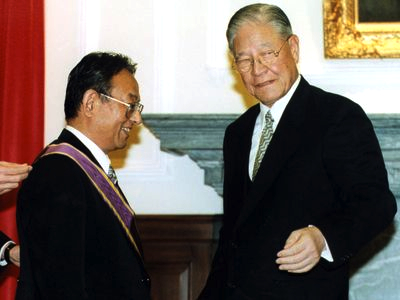 李元総統の退任直前の00年2月、大綬景星勲章を直接授与された中嶋氏(左)(中央社)