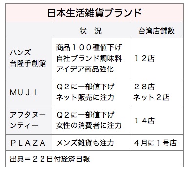 一方、家庭用雑貨品最大手の「ハンズ台隆手創館」は、7割の商品を日本から輸入しており、第1弾として100種近い商品の1割程度の値下げを既に行っている。