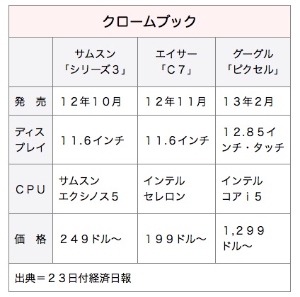 「クロームブック・ピクセル」は1,299米ドルからで、ハイエンド市場がターゲットだ。これまでグーグルが開発したOS(基本ソフト)「クロームOS」搭載ノートPC「クロームブック」は、サムスン電子が「シリーズ3」を249米ドルから、宏碁(エイサー)が「C7」を199米ドルからと、主に教育現場やローエンド市場を狙う低価格路線だった。