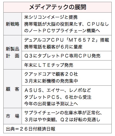 IC設計大手、聯発科技(メディアテック)は25日、スペイン・バルセロナで開幕した移動通信業界の国際見本市「モバイル・ワールド・コングレス(MWC)」で、マザーボードを持たず、ディスプレイとキーボードのみから成るノートパソコンにスマートフォンを「脳」として組み込んだ低コスト製品の生産チェーンを構築するという新戦略を米シリコンイメージ社と共同で推進すると発表。メディアテックの顧客が第2〜3四半期に関連製品を発売するとの見通しを示した。26日付経済日報が報じた。