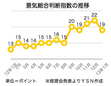 景気対策信号の5カ月連続「黄青」は、昨年12月の総合判断指数が当初「緑(景気安定)」となる23ポイントと発表されたが、今回22ポイントに下方修正されたためだ。