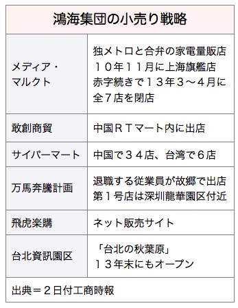 鴻海はこのほか、▽中国で量販店、大潤発(RTマート)内に大型売り場「敢創商貿」を出店▽従業員が故郷に戻って小型店を出店するのを支援する「万馬奔騰」計画▽ネット販売サイト「飛虎楽購」──などを手掛けているが、成果が出ているとの話は聞こえてこない。なお、今年末には「台北の秋葉原」と呼ばれるIT(情報技術)製品販売ビル「台北資訊園区」をオープンする予定もある。