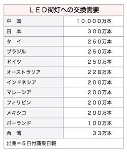 LEDinsideによると、屋外照明のLED化に最も積極的なのは中国、日本、台湾だが、その他新興国でも来年以降相次いで街路灯の大規模なLED化が進む見通しで、15年までは毎年世界で1,000万本のLED街路灯需要が見込めるという。