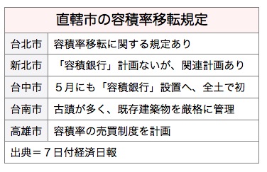 台中市政府は、容積率移転取引を目的とする「容積銀行」を5月にも設置する予定だ。台湾で初の試みで、開発業者が透明な形で容積率移転取引を行えるようにするのが狙いだ。7日付経済日報が伝えた。