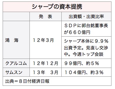 一方、外資系証券会社からは、鴻海は本業の受託生産に専念し、シャープとは戦略パートナーとしての関係を続ければ良く、出資交渉の決裂も悪いことではないとの声が上がっている。