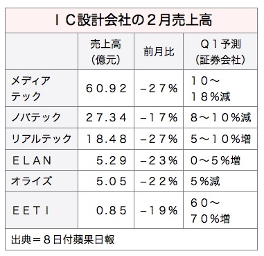 メディアテックが7日発表した2月連結売上高は、前月比27.9%減、前年同月比2.2%減の60億9,200万台湾元(約195億円)だった。サプライチェーン関係者によると、スマートフォン向けチップの出荷は、1月が1,100万セット、2月は800万セットと低迷した。証券会社は、在庫調整シーズンも終わり、3月は1,500万セットも狙えるため、連結売上高は80億元以上と予測している。