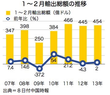 財政部が7日発表した1〜2月の輸出総額は454億1,000万米ドルで、前年同期比2.0%増にとどまった。スマートフォン最大手、宏達国際電子(HTC)の業績低迷が続く中、携帯電話の輸出額が同18.7%減の7億2,000万米ドルで足を引っ張った。葉満足・財政部統計処統計長は、行政院主計総処が4.7%とした第1四半期の輸出成長予測が下方修正を迫られると懸念を示した。8日付工商時報などが報じた。