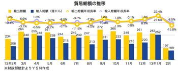 春節(旧正月)連休の影響で、2月の輸出総額は前月比23.1%減、前年同月比15.8%減の197億4,000万米ドルだった。季節調整後は前年同月比2.1%増で、昨年8月以降7カ月連続のプラス成長となった。財政部は、貿易動向の改善が続いている表れと指摘した。