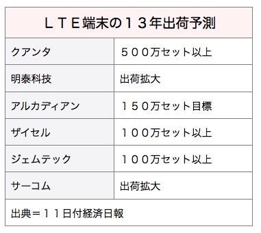台湾ではクアンタのほか、正文科技(ジェムテック・テクノロジー)、智易科技(アルカディアン・テクノロジー)、合勤科技(ザイセル・コミュニケーションズ)などがLTE用のデータ通信カードや端末を生産している。台湾の業界各社による出荷量は合計で年間1,000万セットを超える見通しだ。
