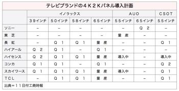 市場調査会社、ウィッツビュー・テクノロジーによると、TCL集団傘下の深圳市華星光電技術(CSOT)も4K2Kパネルに積極的だ。55インチに注力し、価格競争力があることから、第1四半期末にもTCL、スカイワース、四川長虹集団に出荷を開始する見通しだ。
