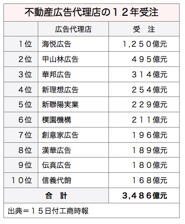 昨年は特種貨物・労務税(ぜいたく税)などの住宅投機抑制策、および不動産の実売価格登録制度導入で不動産の購買意欲が低下したが、建設会社と大手広告代理店が物件を厳選して広告展開を行った結果、効果を発揮。これにより大手とそれ以下の格差が広がった。全体の成約件数6件のうち1件は上位3位の広告代理店が手掛けていた。