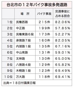 台北市政府警察局交通警察大隊(交通大隊)の統計によると昨年、台北市で最もバイク事故が多かったエリアは民権西路(215件)だったことが分かった。2日に1件以上の頻度でバイク事故が起きている計算になる。なお同エリア内の交通事故総件数は262件で、うちバイク事故が82.06%を占めた。18日付蘋果日報が報じた。