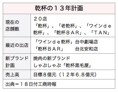 同社傘下のブランドは現在、▽乾杯▽老乾杯▽紅酒乾杯▽乾杯BAR▽TAN──の5つ。昨年は18店で6億8,000万元を売り上げた。今年の売上高目標は8億元だ。