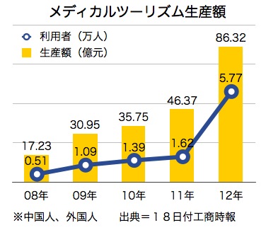 こうした中、メディカルツーリズム関連の2012年生産額は86億3,200万台湾元(約274億円)と前年(46億3,700万元)比2倍近くに成長している。また健康診断・医学美容目的での来台者数も昨年は前年比3倍近い5万7,742人に増加しており、うち4万人以上を中国人が占めている。