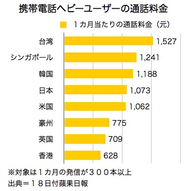 国家通訊伝播委員会(NCC)が台湾経済研究院(台経院)に委託して行った通信料金の国際比較によると、台湾の携帯電話ユーザーで、毎月の通話件数が300件と通話頻度の高い場合、通話料金は1,527台湾元(約4,860円)となり、調査対象とした日本、韓国、香港、米国など8カ国・地域の中で最も高いことが分かった。18日付蘋果日報が報じた。