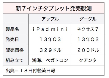 証券会社によると、新iPad miniの販売価格は329米ドル。組み立ては引き続き鴻海精密工業と和碩聯合科技(ペガトロン)が担当し、第2四半期から出荷を開始、第3四半期に大きく量を拡大させる見通しだ。このほか筐体(きょうたい)は可成科技(キャッチャー・テクノロジー)と鎧勝(ケーステック)が、バッテリーモジュールは新普科技(シンプロ・テクノロジー)と順達科技(ダイナパック)が担当するとみられる。
