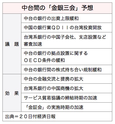 今回の会合で最も注目される議題は、金融機関に対する出資上限の規制緩和で、合意に至れば、中台の銀行業界への相互出資が一気に加速しそうだ。