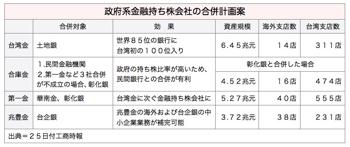 馬英九政権はこのほど、第3次金融改革の方向性として、政府系の金融持ち株会社8社の合併再編を3段階に分けて進め、4社に半減させる方針を固めた。25日付工商時報が伝えた。