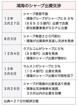 シャープは26日、鴻海科技集団(フォックスコン)から払込期限までに出資がなかったと発表した。鴻海は同日夜、有効期間は2015年まで残されており、協議を重ねて3カ月以内に出資を完了させたいと破局説を否定した。一方証券会社のアナリストは、シャープが求めるのは出資のみで、経営参画を望む鴻海との溝が埋まらないまま、資本提携は実現しないとの見方が少なくない。27日付蘋果日報などが報じた。