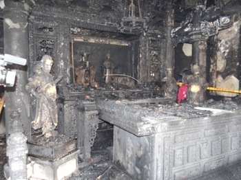 大急ぎで中に入って神像の無事を確かめると、幸いにも表面がすすに覆われているほかに被害はなく、ほっとして目を赤くする信者たちも見られた。