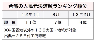 同統計によると、台湾は中国・香港との間の決済額のうち人民元が占める割合が今年2月に44%と、昨年8月の24%から大幅に拡大した。匯豊(台湾)商業銀行(HSBC)の李鐘培総経理は、貿易決済の12%は既に人民元だが、2015年には30%に達すると予測した。