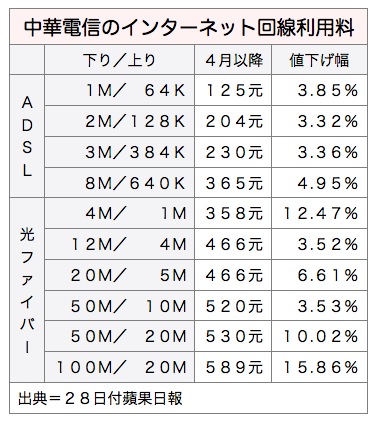 中華電信は27日、インターネット料金のうち回線利用料の引き下げが国家通訊伝播委員会(NCC)に認められ、4月1日から最大15.86%、1カ月当たり111台湾元(約350円)値下げする。ユーザー447万件が恩恵を受ける見通しだ。28日付経済日報が報じた。