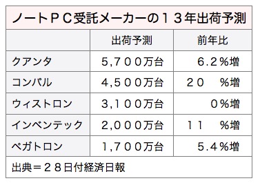 ノートパソコン受託メーカー、英業達(インベンテック)は27日、2013年のノートPC出荷台数が前年比で1割増えると予測を示した。ノートPC市場の需要低迷で同社は過去2年足踏み状態が続き、昨年は約1,800万台だったが、今年は2,000万台に迫る計算だ。28日付経済日報などが報じた。