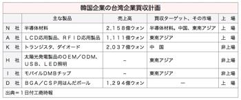 台湾企業の買収に関心を示している6社は、半導体素材、液晶、RFID、太陽電池、通信用チップなどの分野の企業で、うち3社は上場企業だという。