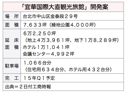 同開発案は2010年9月に着工した。敷地面積7,633坪にホテルコンドミニアムのほか、地上19階までをホテル(客室数320室)、20~34階までをサービスアパートメント(28室)とするC棟、地上7階建ての国際会議センターのD棟の4軒の建築物で構成される。また、4,000坪以上の公園も設置し、総投資額は土地取得費用を除き150億台湾元(約470億円)以上となる。すべて完成するのは15年第1四半期の見通しだ。