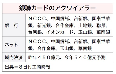 現在地場銀行では、▽中国信託商業銀行(中信銀)▽台新銀行▽国泰世華銀行▽合作金庫商業銀行▽玉山商業銀行(Eサン・コマーシャル・バンク)──などが提携している。中でも中信銀と台新銀の決算額は毎月10億元を超えていることから、両行が他行に先駆けて銀聯カードの発行銀行となる可能性が高いと業界関係者はみている。