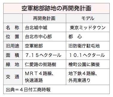 行政院はこのほど、台北市中心部の仁愛路沿いにある空軍総部跡(面積7.15ヘクタール)の再開発計画について、行政院経済建設委員会(経建会)の報告を受け、東京・六本木の東京ミッドタウンをモデルに複合開発を進める意向を明らかにした。4日付工商時報が伝えた。