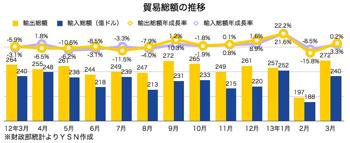 なお3月の輸入総額は前年同月比0.2%増の240億3,000万米ドル。第1四半期累計では前年同期比4.4%増の680億米ドルとなった。