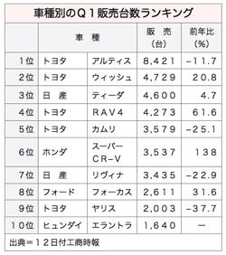 業界関係者は上位10車種のうち5車種を占めるトヨタブランドについて、1位のアルティス以外に、「カムリ」(同25.1%減)、「ヤリス」(同37.7%減)が大きく販売台数を落としたほか、「ヴィオス」は初めて上位10位から転落するなど、商品ライフサイクルの後半に差しかかっていると指摘した。
