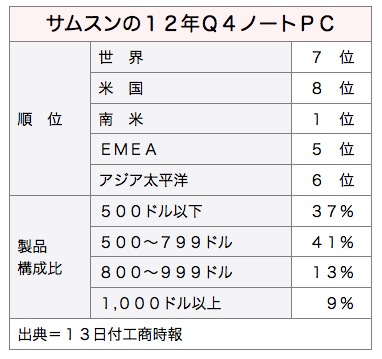 市場調査会社、デジタイムズ・リサーチの統計によると、第1四半期のノートPCの世界出荷量は前期比14.1%減、前年同期比13.7%減と落ち込んだ。一方、サムスンは華碩電脳(ASUS)を抜いて5位に付け、宏碁(エイサー)と30万台差に迫った。昨年は出荷台数1,300万〜1,400万台で世界7位だった。