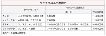 AUOは現在モジュール月産能力が70万枚で、年末に150万枚以上に引き上げる予定だ。サプライチェーンによると、AUOはヒューレット・パッカード(HP)から既に認証を得ており、第2四半期末か第3四半期初めに量産する計画だ。ソニーは今年のノートPC製品にタッチパネルを全面採用する計画で、AUOが主にタッチパネルを供給するようだ。