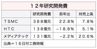 研究開発費2位はスマートフォン最大手、宏達国際電子(HTC)で同18.8%減の138億元(同5.1%)だった。3位はIC設計最大手、聯発科技(メディアテック)で同2.2%減の131億元(同20.6%)だった。