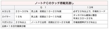 同社は、台北エリアでのノートPC販売で、タッチ搭載機種の占める割合が20〜30%となり市場平均の15%を上回ると予測している。