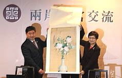馮院長(右)から北京故宮博物院の単霽翔院長(左)に清朝のイタリア人宮廷画家ジュゼッペ・カスティリオーネの「聚瑞図」(国立故宮博物院所蔵)の複製品が送られた(19日=中央社)