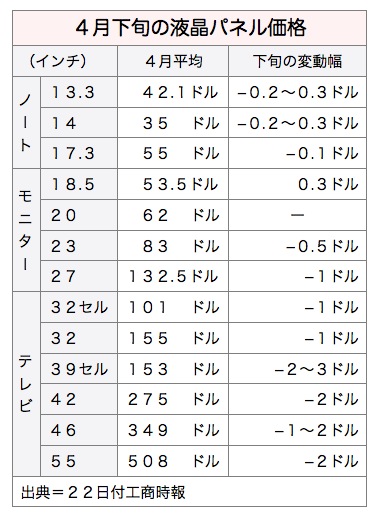 市場調査会社、ウィッツビュー・テクノロジーによると、サムスン電子の40インチパネル大幅値下げを受け、4月下旬のテレビ用液晶パネル価格は39、42インチで1〜3米ドル押し下げられた。22日付工商時報が報じた。