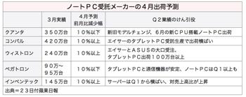 仁宝電脳工業(コンパル・エレクトロニクス)は、3月は出荷が好調だったため、4月は10%以上の落ち込みを予測している。ただ証券会社は、宏碁(エイサー)のタブレット型PCの新製品によって、ノートPCの落ち込みを補い、出荷全体で横ばいになるとみている。