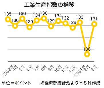 3月の工業生産指数は131.16ポイントで、うち9割以上を占める製造業生産指数は前年同月比3.24%下落の134.48ポイントと2カ月連続のマイナス成長となった。中でも機械設備業は同13.63%下落の99.44ポイントと、製造業の中で最も下落幅が大きかった。次いで自動車・部品業が108.59ポイントで同9.20%下落した。